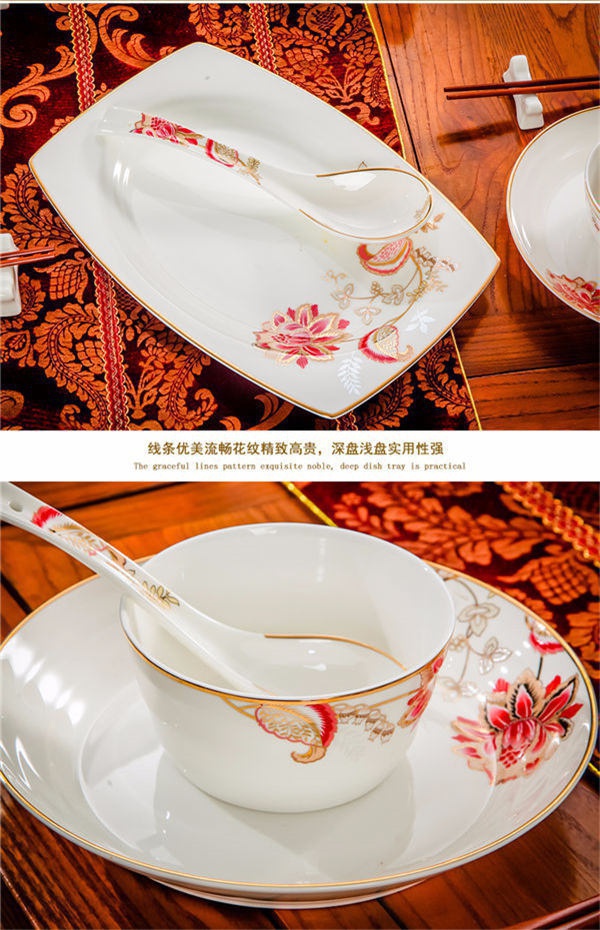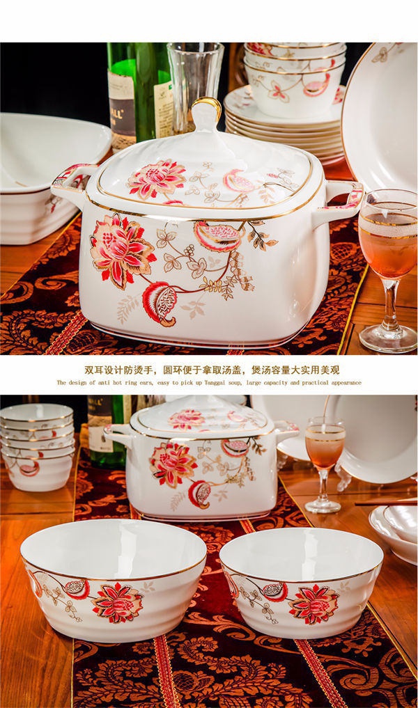 65頭醉花吟,一個(gè)湯煲,一個(gè)魚(yú)盤(pán),一個(gè)大飯勺,一個(gè)大湯碗,一個(gè)牙簽筒,六個(gè)面碗,四個(gè)三寸碟,十個(gè)盤(pán)子,十個(gè)4.5寸飯碗,十個(gè)五寸骨碟,十個(gè)調(diào)羹,十個(gè)筷子架。