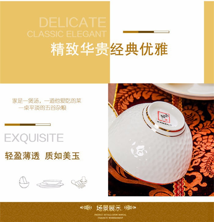 60頭水立方,一個(gè)湯煲,一個(gè)魚(yú)盤(pán),一個(gè)十寸圓盤(pán),一個(gè)飯勺,一個(gè)花籃,一個(gè)牙簽筒,四個(gè)面碗,十個(gè)4.5寸飯碗,十個(gè)三角骨碟,十個(gè)八寸盤(pán),十個(gè)調(diào)羹,十個(gè)筷子架。