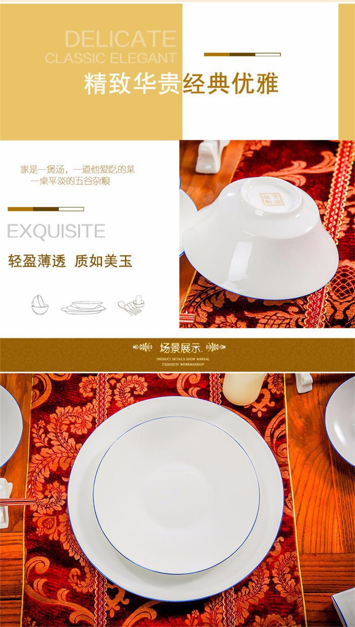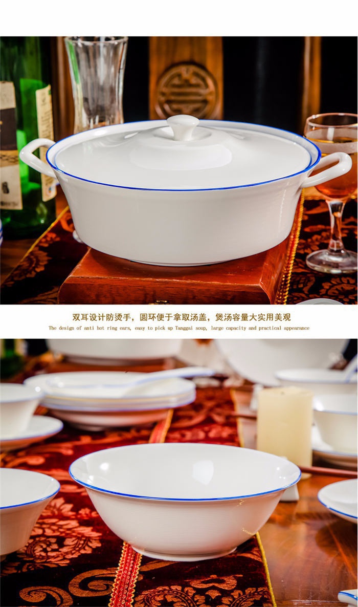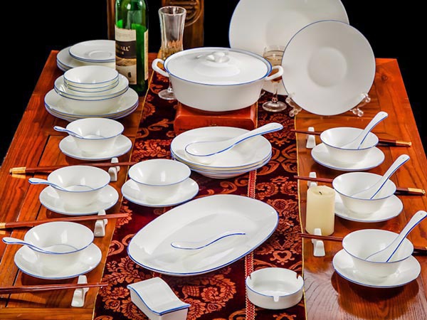 58頭蘭邊螺旋,一個(gè)湯煲,一個(gè)魚(yú)盤(pán),一個(gè)十寸圓盤(pán),一個(gè)飯勺,一個(gè)煙灰缸,一個(gè)牙簽筒,兩個(gè)面碗,十個(gè)4.5寸飯碗,十個(gè)五寸骨碟,十個(gè)八寸盤(pán),十個(gè)調(diào)羹,十個(gè)筷子架。
