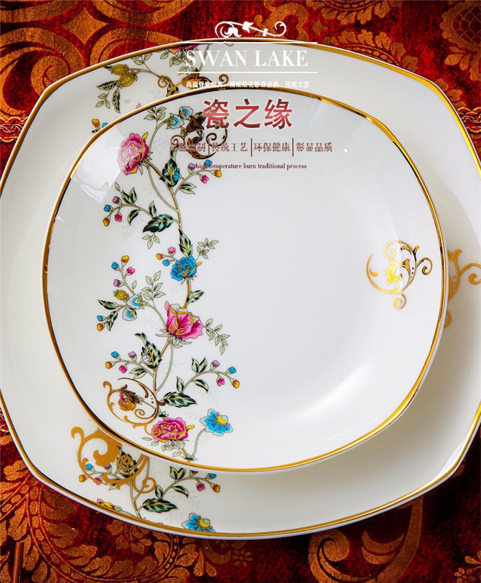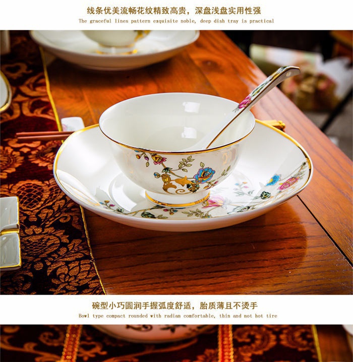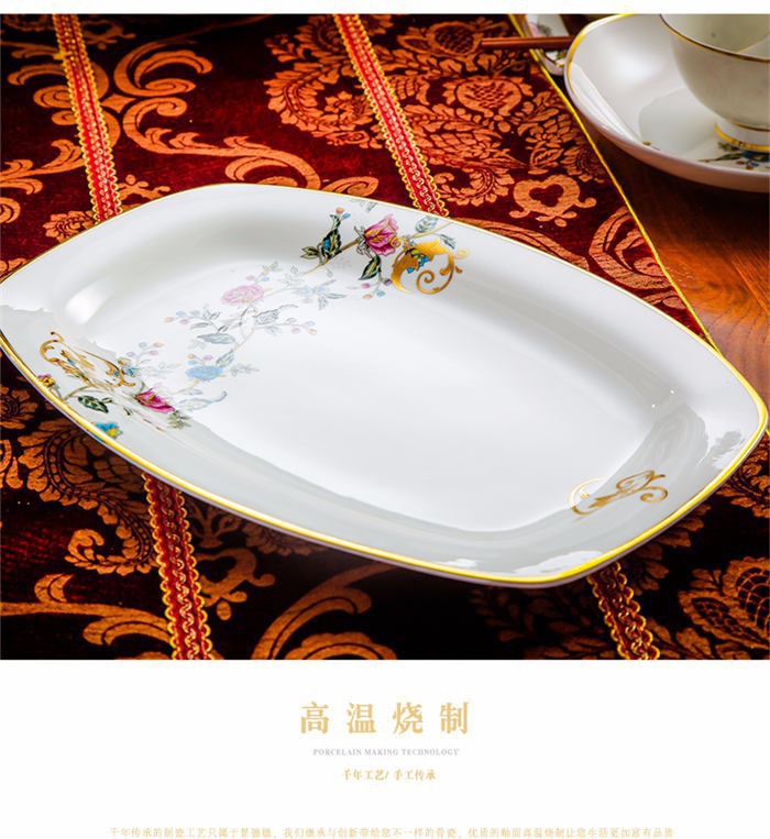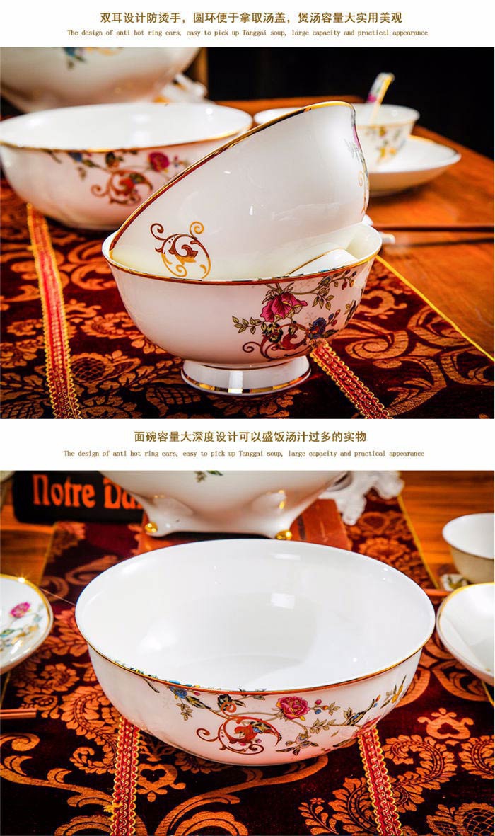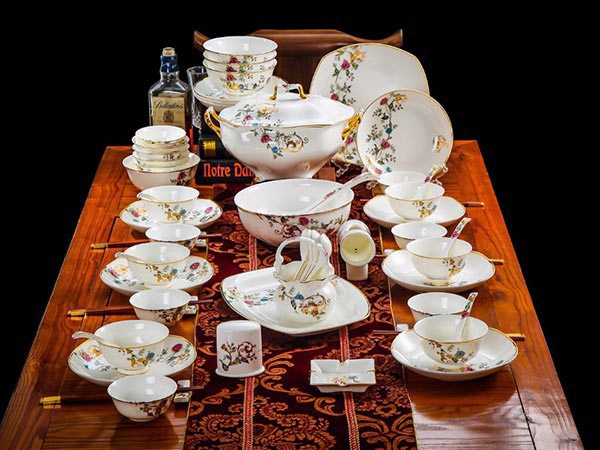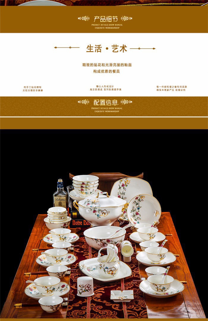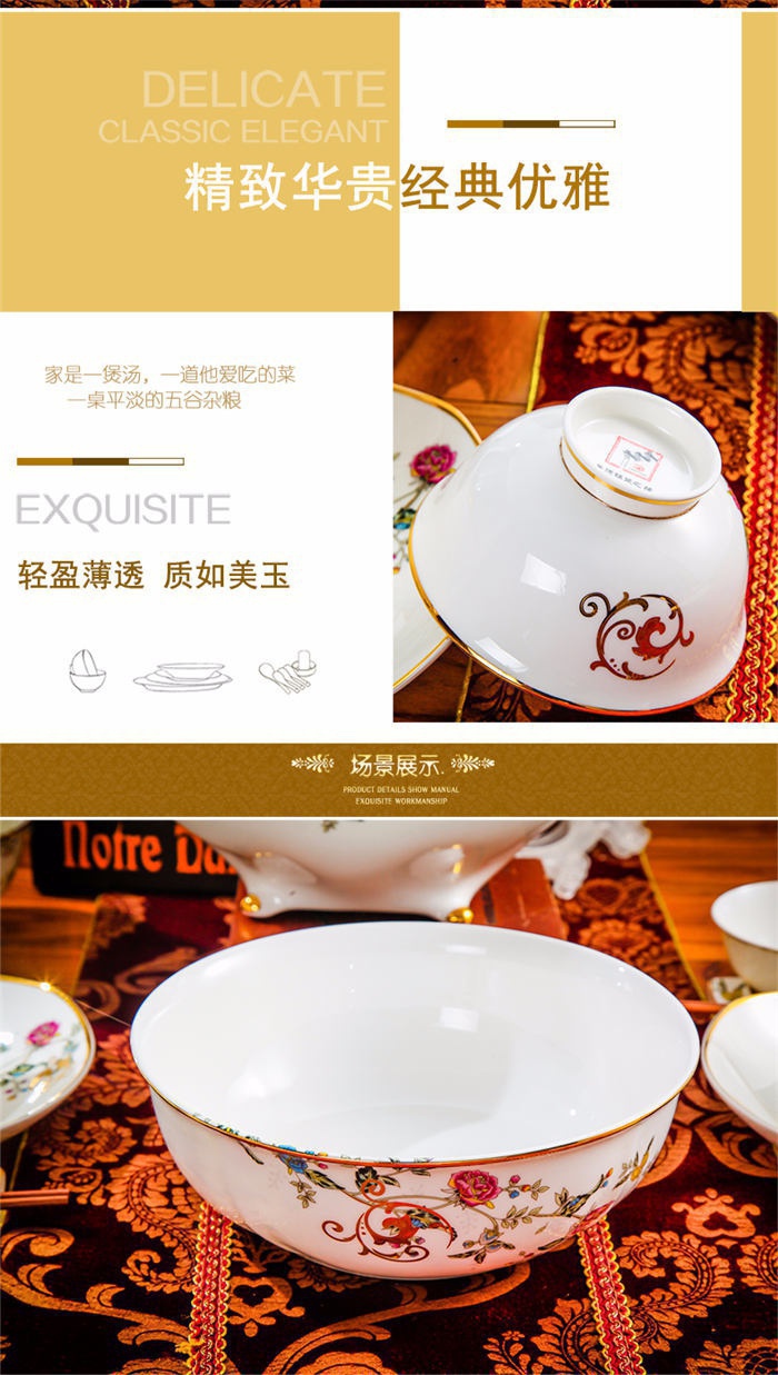 63頭景色滿園 一個湯煲,一個魚盤,一個十寸圓盤,一個飯勺,一個煙灰缸,兩個胡椒瓶,四個面碗,一個雙層水果盤,一個美鵝,十個4.5寸飯碗,十個五寸骨碟,十個八寸盤,十個調(diào)羹,十個筷子架。