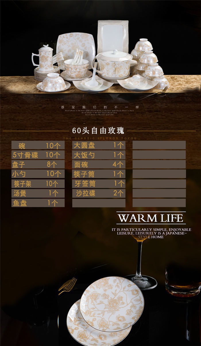 碗十個(gè),5寸骨盤十塊,盤子八塊,小勺十個(gè),筷子架十個(gè),湯煲一個(gè),魚盤一塊,大圓盤一塊,大飯勺一個(gè),面碗四個(gè),筷子筒一個(gè),牙簽筒一個(gè),沙拉碟二個(gè)