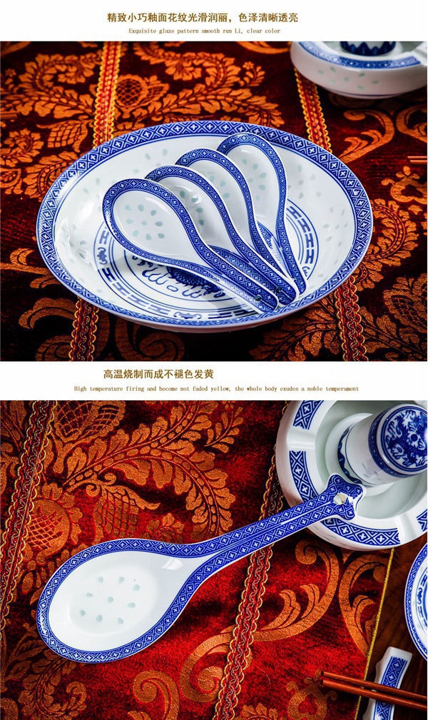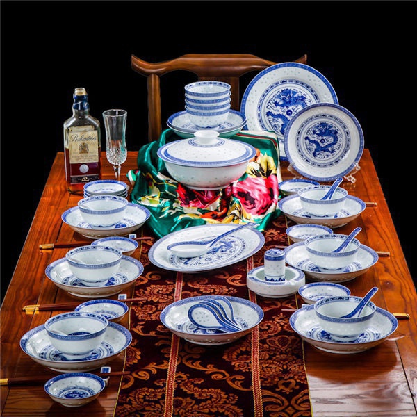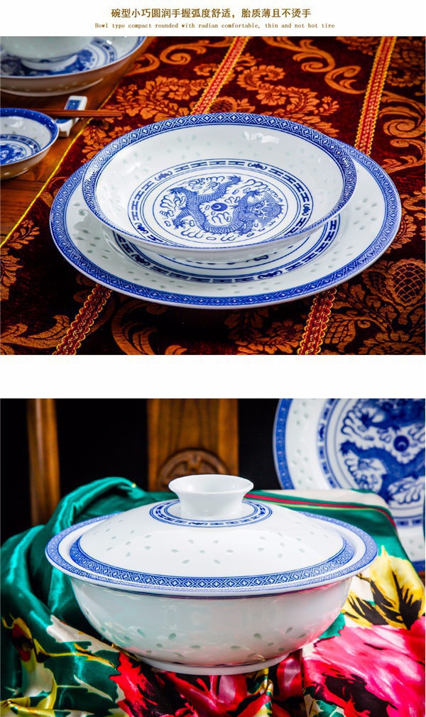 56頭高白龍的青花玲瓏餐具,一個湯煲,一個魚盤,一個十寸圓盤,一個飯勺,一個煙缸,一個牙簽筒,十個4.5寸飯碗,十個三寸碟,十個八寸盤,十個調羹,十個筷子架。56頭高白龍的青花玲瓏餐具,一個湯煲,一個魚盤,一個十寸圓盤,一個飯勺,一個煙缸,一個牙簽筒,十個4.5寸飯碗,十個三寸碟,十個八寸盤,十個調羹,十個筷子架。