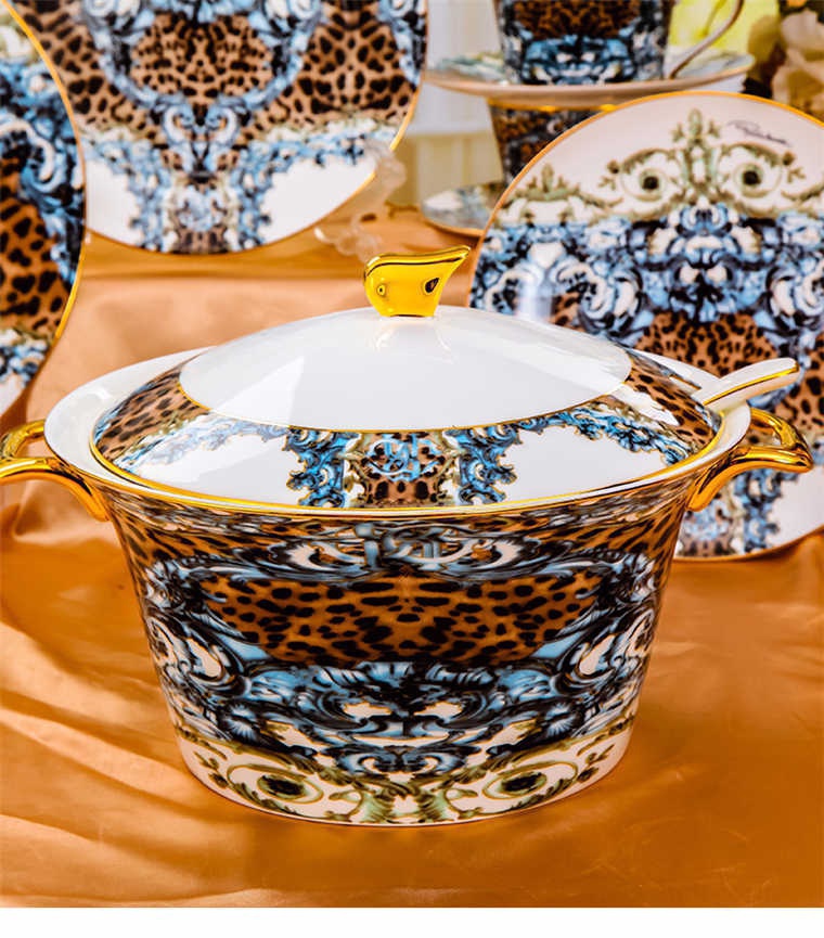 71頭范思哲豹紋餐具,一個湯煲,一個大湯碗,一個大湯勺,一個煙缸,兩個胡椒瓶,一個魚盤,一個10寸盤,六個9寸深盤,六個8寸平盤,六個8寸月光盤,十個4.5寸飯碗,十個小勺,十個筷子架,一個咖啡壺,一個糖缸,一個奶罐,六個咖啡杯,六個碟。